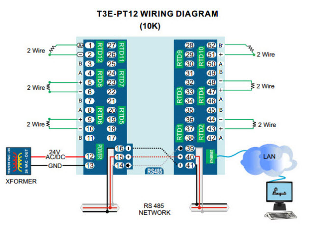 The unit accepts platinum Pt elements, elther 100 ohm or 1k ohm variety. lt also can accept 10k thermistors, Type ll and Type ll. Cabling can beaccomplished using two, three or four wire connections. Communications is suppored over Bacnet and Modbus over both RS485 and the Ethernetiports. All readings and the various settings are available as Bacnet obiects and Modbus registers.Each of the sensors connecis to a terminal block which can be plugged in and out without disturbing adiacent sensor connections. There are twelvesensor channels and the sensors can be wred with three and four wire connections for instrument grade readings over long distances. For shorerdistances and where accuracy is not so critical a standard wo wire connecion works fine in manv applicaions, Note however that due to spacelimitations the sensors on channels 9 thru 12 are limited to three wires. channels one through eight can have the 2, 3 or 4 wire connections.The Rs485 connections have two separate terminal blocks to make Rs485 troubleshooting easier,they are not acuall separate RS485 ports but arewired internally together to make it easy to separate the network during commissioning.Power can be provided by any convenient supply from 12 volts up to 24 vots AC or Dc. The interal power supply is half wave rectified so thatseveral devices can share the same transiormer A self reseting fuse auards aoainst around oons and over voltaae condions