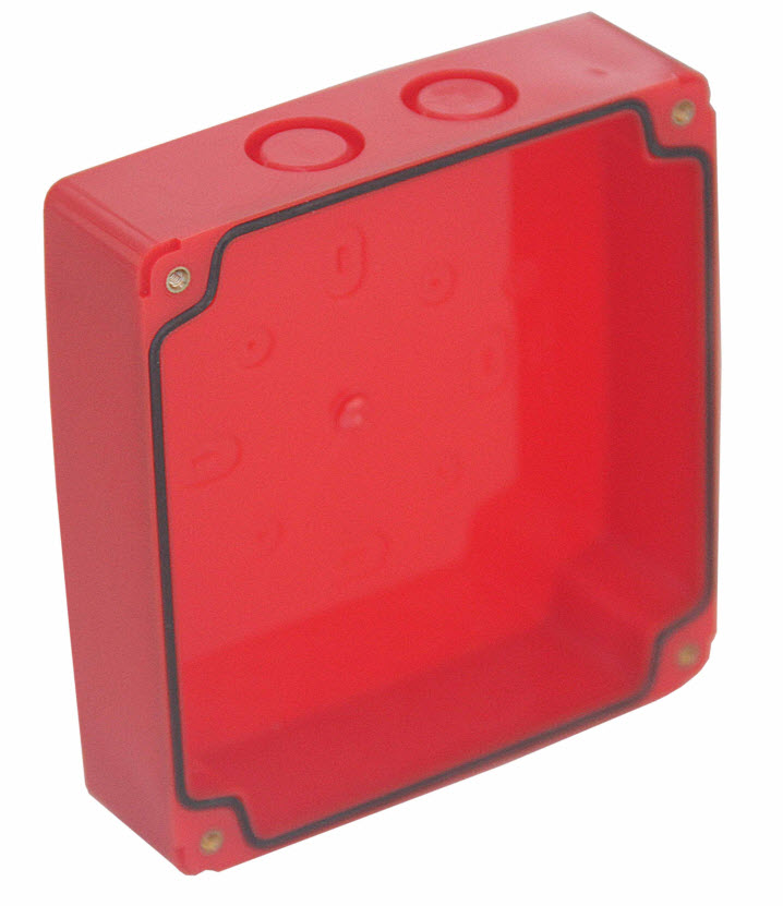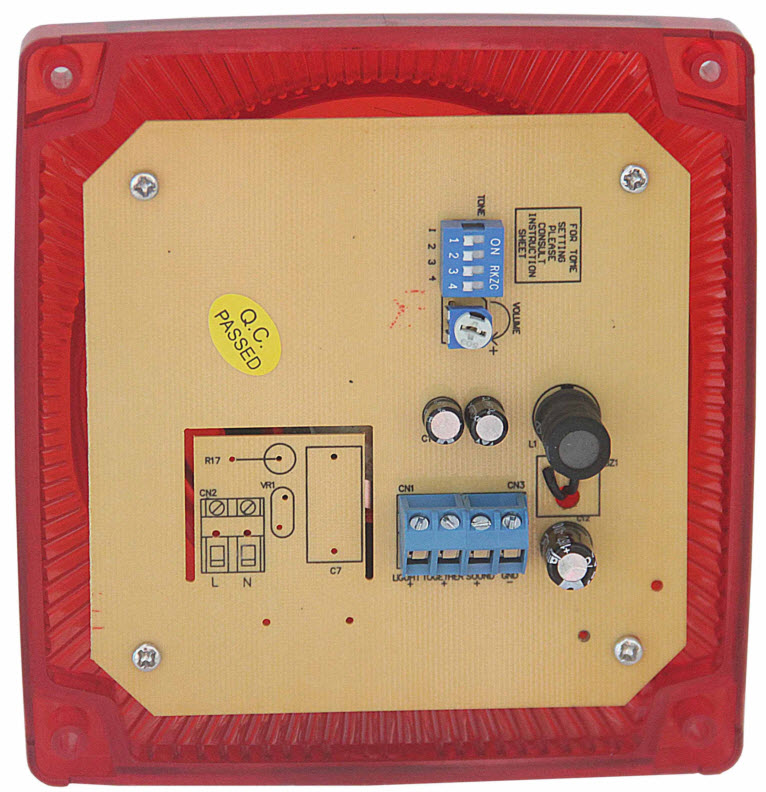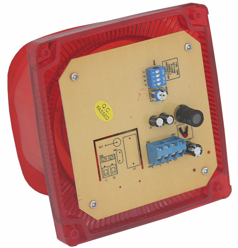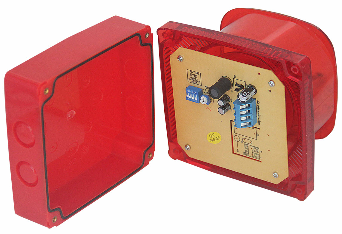 The strobe sounder announces alarms with a 100dB horn and bright LED. IP65 ABS enclosure with 8 selectable tones and adjustable volume.